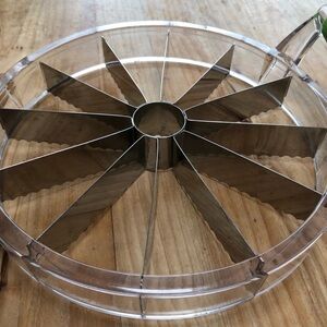 Effortlessly slice melons with this stainless steel slicer. Features vibrant green handles for a comfortable grip. Cuts melons , watermelon and cantaloupe into 12 even pieces. Can use for pineapple , lemons and oranges. Perfect for making fruit trays quickly.- new or rarely used.