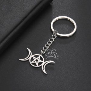 Stainless Steel Pagan Triple Moon Star Key Chain Silver