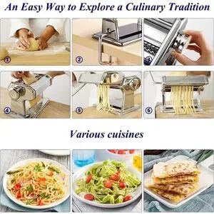 Create delicious homemade pasta with this stainless steel pasta maker. Its sleek silver design adds a modern touch to your kitchen. Perfect for pasta enthusiasts.