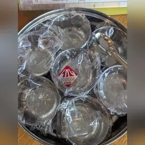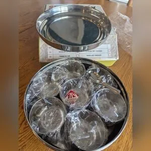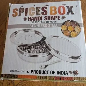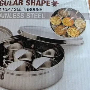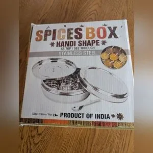 Organize your spices with this stainless steel spice box. The item is not as pictured on the box front. It comes with one stainless steel lid and six spice containers and one scoop.