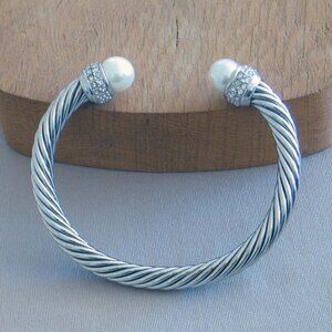 It's a must have bracelet! Elegant cuff bracelet with a pearl and clear stones at each end. New, never used. You could wear it with a fancy outfit or for everyday at work.
