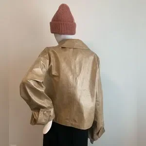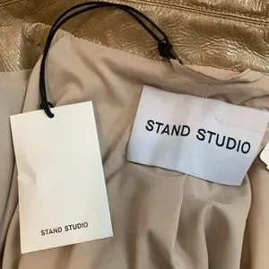 Stand Studios jacket featuring an oversized, cropped fit and patent finish. Style is inspired by a French coat. Never Worn!
