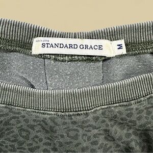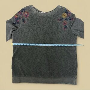 Gently worn, mossy green leopard print sweatshirt/top with a beautiful flowery embroidered shoulder detail. Round/Boat neck. Size women’s medium by Standard Grace. On the back, this top has crisscross ties with a bow at the bottom. This area has a backing, so it does not show your skin. Has a baggy fit. Measurements are in the photos.