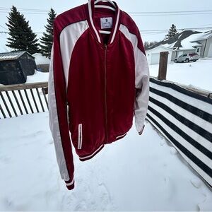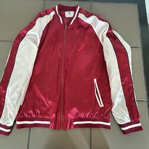 Bold bomber jacket with striking red and white contrast. Ideal for a standout look.