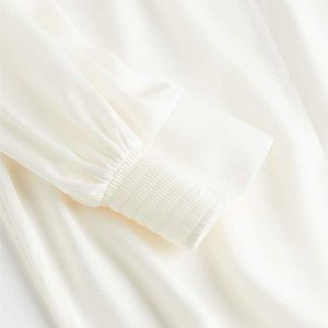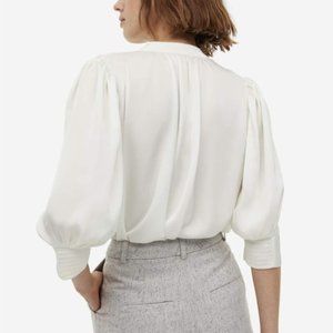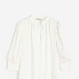 Blouse in woven fabric. Low stand-up collar, V-neck, and elbow-length puff sleeves with smocked section at back of cuffs.
