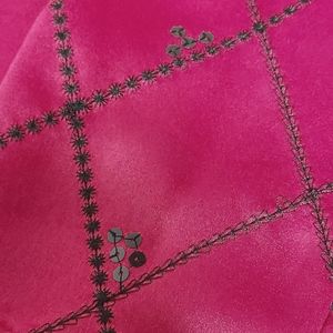 Stand out from the crowd in this Stanley Scott Vintage Satin Jacket. Cerise pink colour with black. Wear with the collar up or down for two different looks. Black diamond design stitching on sleeves with black sequins. 100% Polyester. Hand wash or dry clean. Size Small, approx. measurements laying flat length 22.5in, pit to pit 19in, waist 17in, Hemline 20in, sleeve length 24in. Formal garment in excellent condition. Great for event, party or business wear. This item doesn't fasten and is designed to have an open look. However a press stud could easily be added.