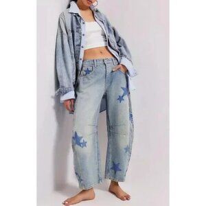 Star Contrast Pattern Light Wash Baggy Weekend Barrel Style Jeans Pants Trousers