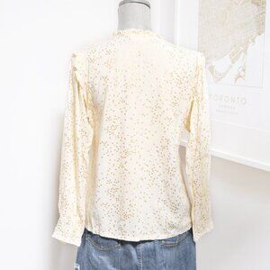 Pretty light cream colored long sleeve blouse with ruffle details at the neck and shoulders. Gold stars all over the front and back. Made in China