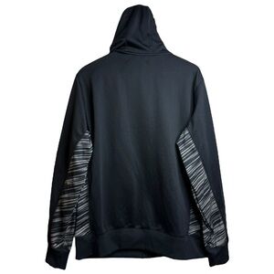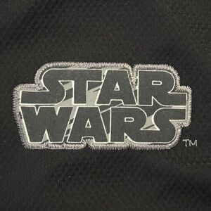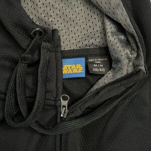 Features: Star Wars spell out fabric patch on front left chest, hoodie has mock neck and hood with thick drawstring, inside of hood is gray mesh, black material is textured, inside is lined (feels like fleece),