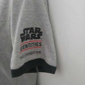 Simple, classic top. Easy to wear. Rounded neckline. Boba Fet mask graphic abstract image on front. Gray with black borders on sleeves and neckline.