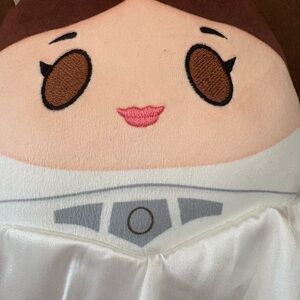 This delightful Star Wars stuffed animal features a soft white outfit and charming brown hair styled in iconic buns. Its gentle brown eyes and rosy cheeks add to its adorable appeal, making it perfect for cuddling and imaginative adventures.