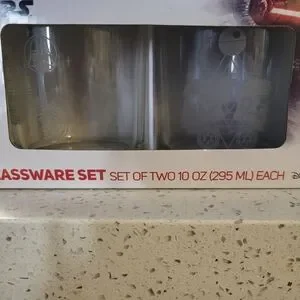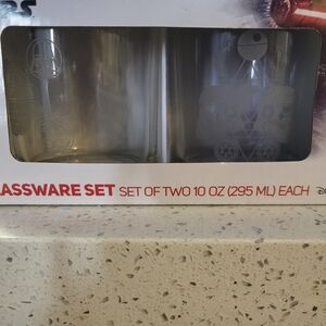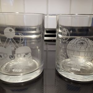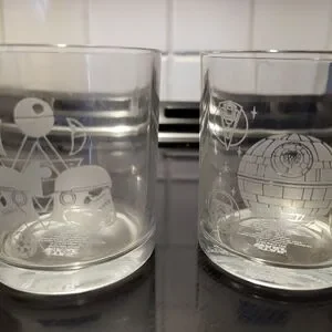 Set of two 10 oz glasses. Features Star Wars designs. Perfect for fans.