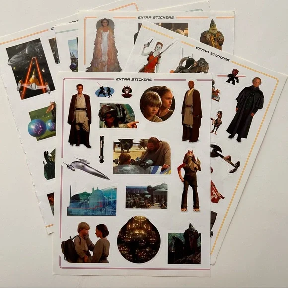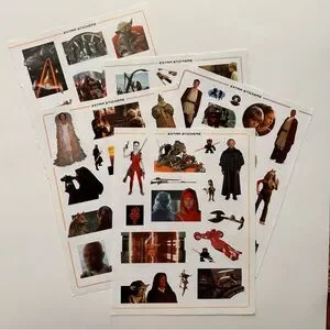 Star Wars sticker sheets. This bundle of 7 sheets 81/2 x 11 features movie characters and scene artwork. Also in this bundle is one sheet of small stickers .5 x .5 inch