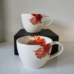 Starbucks 2008 set of 2 White/Orange/Red Poppy Flower Ceramic Coffee Mugs.