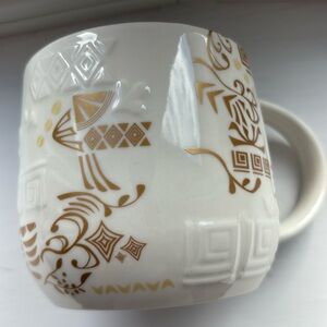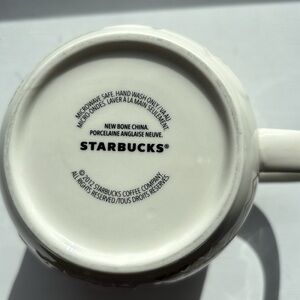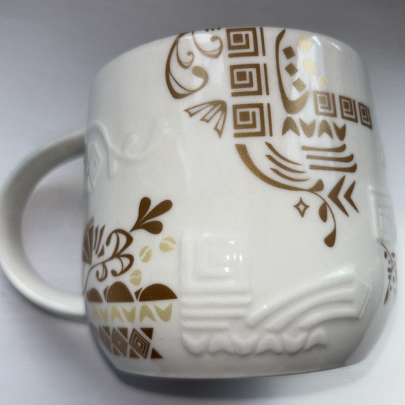 Starbucks 2012 cream coffee mug with unique Asian design in mint condition. Raised geometric shapes. Two graphics on the inside of the mug. Holds 12 oz.