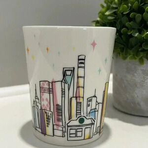 New without tags. Rare. White base with pastel sketched city scene. 3D raised Starbucks Store in city scene. Teal blue inside. Microwave & dishwasher safe.