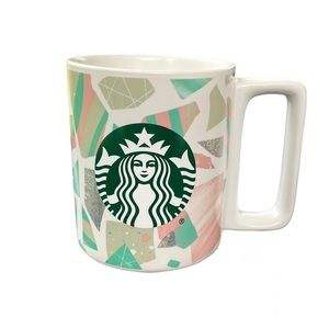 Starbucks 2019 Terra Confetti Foil Ceramic Coffee Mug Tea Cup 12oz A Gorgeous Pastel Crystal/Geometric Mug Complete with A Square Handle This mug is patterned with pastel green (mint) and pink geometric shapes and silver holographic detailing. It has a cool square handle which makes it easier to stick all your fingers into the handle while holding (unlike the rounded ones) Front graphic is Starbucks Green Mermaid Logo Note: *Do Not Microwave *Hand Wash Only Due To Metal Foil Designs. Pre-loved and gently used. Good Condition. No Stains or Cracks. (Please see photos) Tags: Terazzo, Pastel, Mosaic, Metallic, Gems, Square handle, Mermaid, Geometric, Starbucks