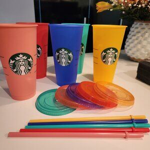 Set of five Starbucks reusable color changing cups. Each cup comes with a matching lid and straw. Cups change color when filled with cold liquid.