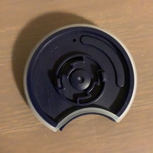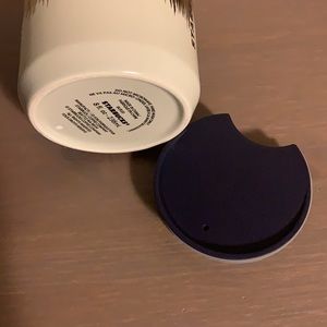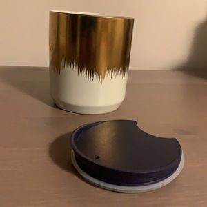 EUC Starbucks white and gold ceramic to go cup with black plastic lid.