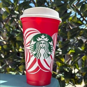 Bold red tumbler with white swirl design. Features Starbucks logo.