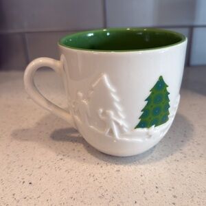Festive mug with a green interior and white exterior featuring a Christmas tree design. Perfect for holiday drinks.