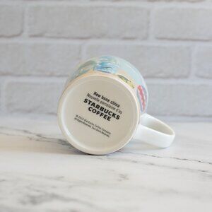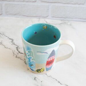 Colorful Starbucks Hawaii mug featuring a playful surf and beach design with surfboards, ocean waves, sea turtles, fish, and even a shark motif. Interior is bright aqua with fish accents. This mug was released in 2010 and is made of new bone china. A fun and collectible Starbucks piece that captures the spirit of Hawaii.