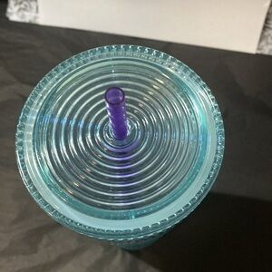 Stylish iridescent tumbler with a purple straw. Perfect for drinks on the go.