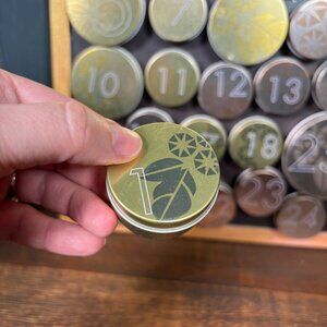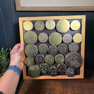 Celebrate the holidays (or prep early for next season!) with this original Starbucks Magnetic Tin 25 Day Holiday Advent Calendar. This calendar from around 2013 (holiday line) features a 12" × 12" magnetic board frame and 25 reusable tin containers — perfect for small gifts, treats, trinkets, or DIY surprises. Two tin sizes (approx. 1.75" and 2.5" in diameter), plus the large “25” tin (3" dia), all about 0.75" high. The tins are empty and ready for creative re-use or refilling.