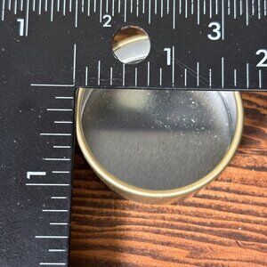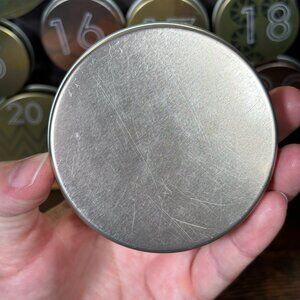 Tins: two sizes — ~1.75" and ~2.5" diameter; “25” tin ~3" diameter; all tins ~0.75" H