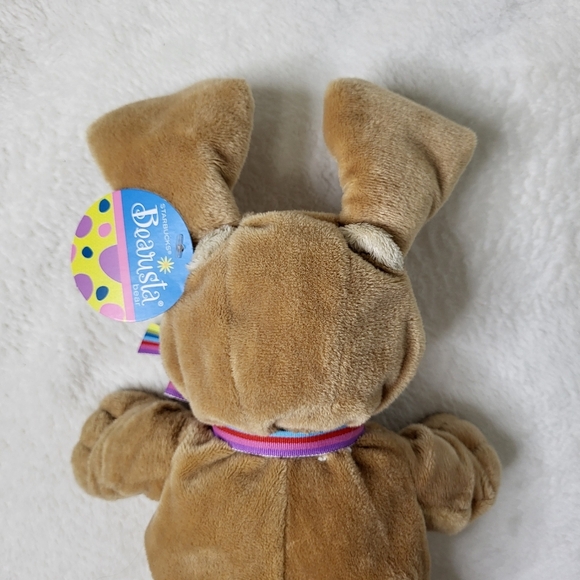 Adorable plush bunny bear with a colorful striped bow. Soft tan fur and white belly.