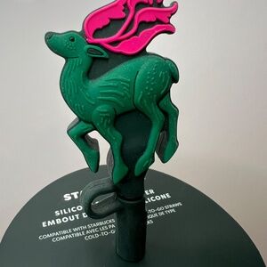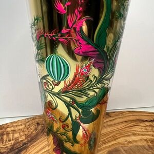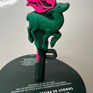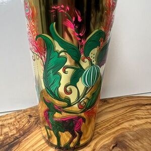 Celebrate the holiday season in style with this rare Starbucks Christmas Reindeer Tumbler in a stunning gold and green colour scheme. With a 24 oz capacity, this original 2024 creation features a festive silicone reindeer topper and a matching hot pink straw for sipping on your favourite coffee or tea. Perfect for collectors or Starbucks enthusiasts, this unique tumbler adds a touch of holiday cheer to your drinkware collection. Made with quality craftsmanship, this item is a must-have for any Starbucks fan. Brand new with tags. No flaws.