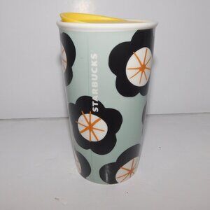 Starbucks Spring Green Black White Floral Ceramic Travel Tumbler Yellow lid