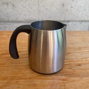 Previously and gently used by us for steaming milk for lattes. Has a few surface scratches but no flaws that prohibit it from doing its job.
