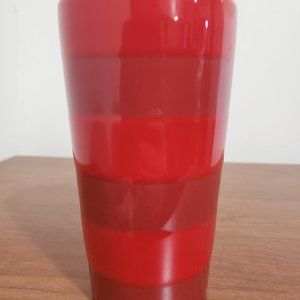 A stylish and collectible piece that seamlessly combines form and function. This travel mug, designed for the year 2021, showcases a striking red hue with a unique two-tone stripe pattern, creating a visually appealing and modern aesthetic.