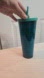 Sip in style with this genuine Starbucks Venti Cold Cup. Features a deep navy blue/dark teal body contrasted with a bright mint green lid and matching straw.