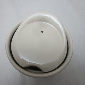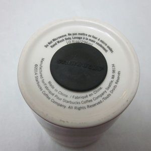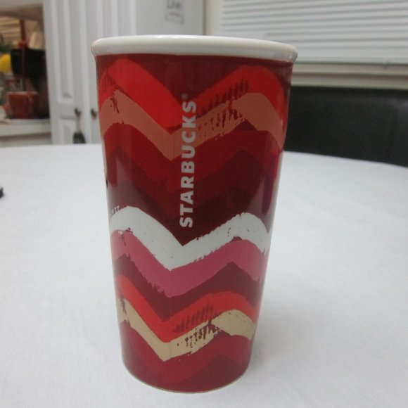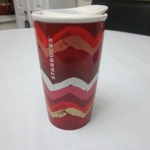 A Starbucks travel mug with a red chevron design from 2014. It's in good condition and is ceramic.