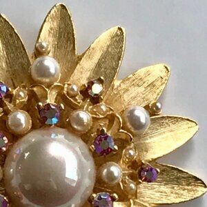 Starburst Floral Brooch/Pin Pearls/Rhinestone Gold finish costume jewelry 2"