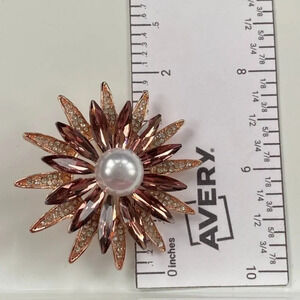 Stunning brooch with burgundy wine colored navette and clear sparkly rhinestones on alternating petals set in gold tone setting with faux pearl centre