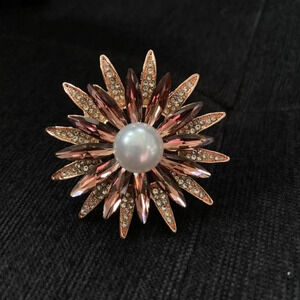 Stunning brooch with burgundy wine colored navette and clear sparkly rhinestones on alternating petals set in gold tone setting with faux pearl centre