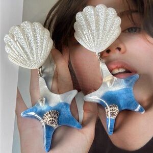 Add a touch of oceanic charm to your child's outfit with these blue and white starfish shell earrings. Perfect for any occasion.