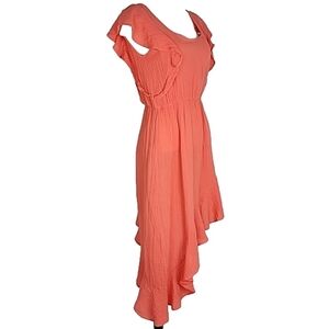 New with tags, Stark X Ruffle assymetrical dress in a lovely strawberry coral pink colour with fun ruffles and made of 100% soft and floey cotton, size Small.