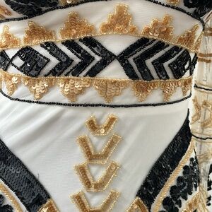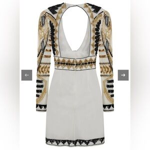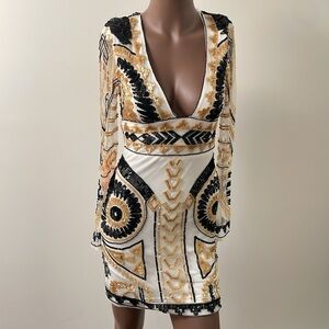 Adorned with black and gold sequins in a bold graphic motif, this white mini dress is a striking style that will ensure all eyes are on you! This dress is designed with a plunge neckline and full length sheer sleeves. This dress has a concealed zip at back.