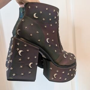 Step into style with these stunning Starry Night Platform Ankle Boots. Featuring a unique design with star and moon embellishments, these black boots are perfect for making a statement. Elevate your look with these chic and bold shoes.