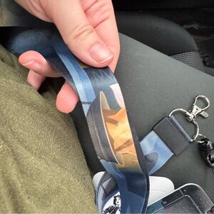 Stylish lanyard with a starry night design. Comes with an ID holder featuring a cozy campfire scene.