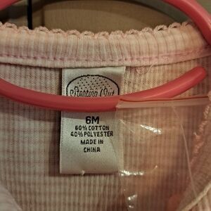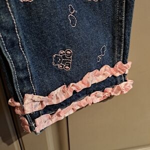 NWT Starting Out 6 months long sleeved shirt with matching jean overalls with embroidered bears & hearts. pink ribbon ruffles at bottom of legs, snaps around the inseam and waist