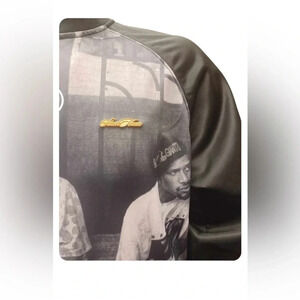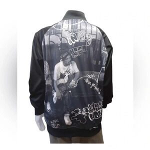 Black with black and white graphics, this jacket features long sleeves and a zipper closure. There are two flat, zippered pockets ( both pulls present)