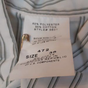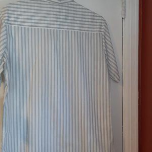 cotton short sleeve equestrian riders dressage hunter jumper show shirt lightweight cotton white with strips comes with seperate removable collar ratcather. great show shirt at a great price, size 36 or ladies small (but a generous cut)