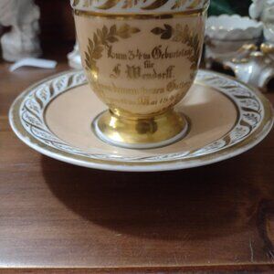 KPM Berlin fantastic antique cup and saucer. Peach and white with heavy gold. Cup has scrollwork serpent/gargoyle head handle, and a footed base. Very good antique condition, (cup excellent) no cracks or chips. Moderate gold wear to outside edges of saucer. Marked on base dating it to approximately 1840. Likely a custom order for someone celebrating a birthday or anniversary, inscribed on front of cup in gold lettering (in German).