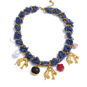 Turn heads with this bold statement necklace, featuring a unique mix of blue denim chain links, luminous pearl accents, and delicate acrylic flower drops. Crafted with stainless steel hardware, this vintage-inspired piece adds texture and edge to your wardrobe—perfect for layering or wearing solo.