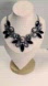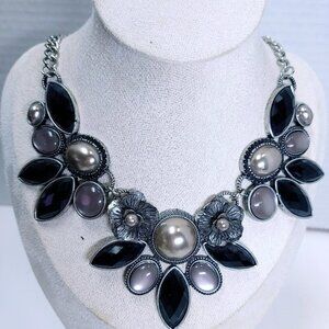 Statement Necklace Antique Silver Daisies Smoky Grey Crystal Droppers faux Pearl